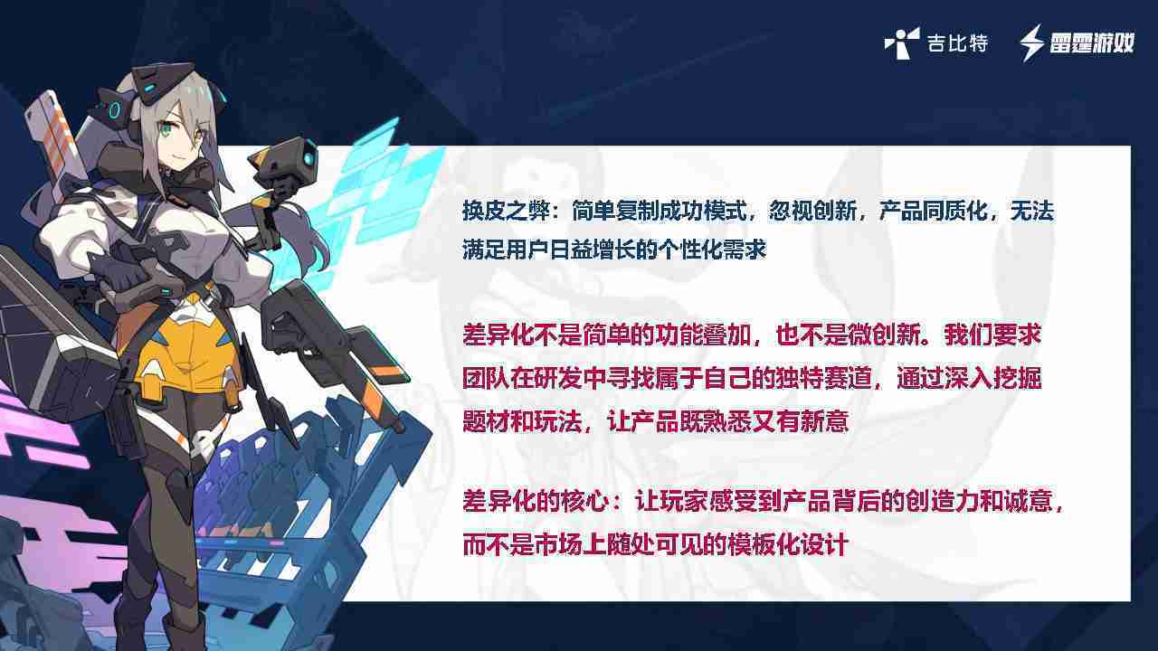 在我们内部是这么定义差异化的。。首先,,差异化不是简单的功能叠加,,更不是换皮。。。只是换皮,,产品无法提供有效的市场价值。。内部经常说差异化的产品不是为了迎合市场,,而是找到一个自己独特的表达方式,,,,在研发中找到属于自己的细分赛道和独特赛道,,,前提是需要对这个题材有足够的深入、、、、挖掘,,,对玩法有足够深入的理解,,,让产品看起来既熟悉又有新意。。