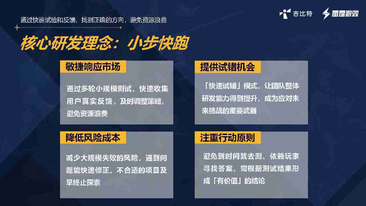 小步快跑不是找答案,,,,而是验证答案。。。。我们之前有项目是这样的,,有些制作人会有几个方向觉得都可以做,,,但是不确定做哪一个,,会选择几个都做,,,,做完拿到市场跑,,跑出哪一个更好,,,基于这个再做后续的研发和拓展。。。。但这种情况最容易出现一个问题,,,可能被玩家裹胁,,玩家说这个点不错、、、那个点不错,,,到底听还是不听,,,,不听感觉是无视玩家的反馈,,听的话,,可能自己没想清楚导致研发思路发生偏颇。。。。所以针对这一点后面自己复盘整理,,发现制作人自己心里要有数,,,,要做自己觉得好玩的,,,,而且明确知道这个东西是你想做的,,然后拿到市场验证这个答案是不是对的,,,而不是拿一堆答案找哪一个答案更好。。